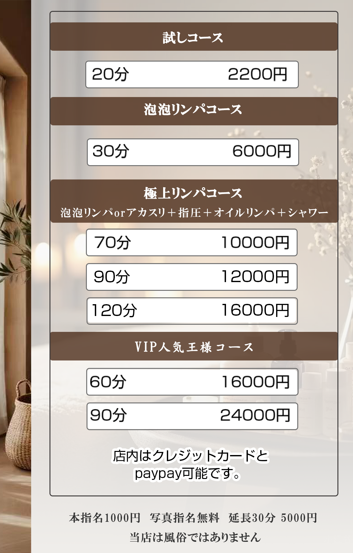 | その他 | 当サロンは風俗店ではございません。 また、回春などのサービスも一切ありません。 |
